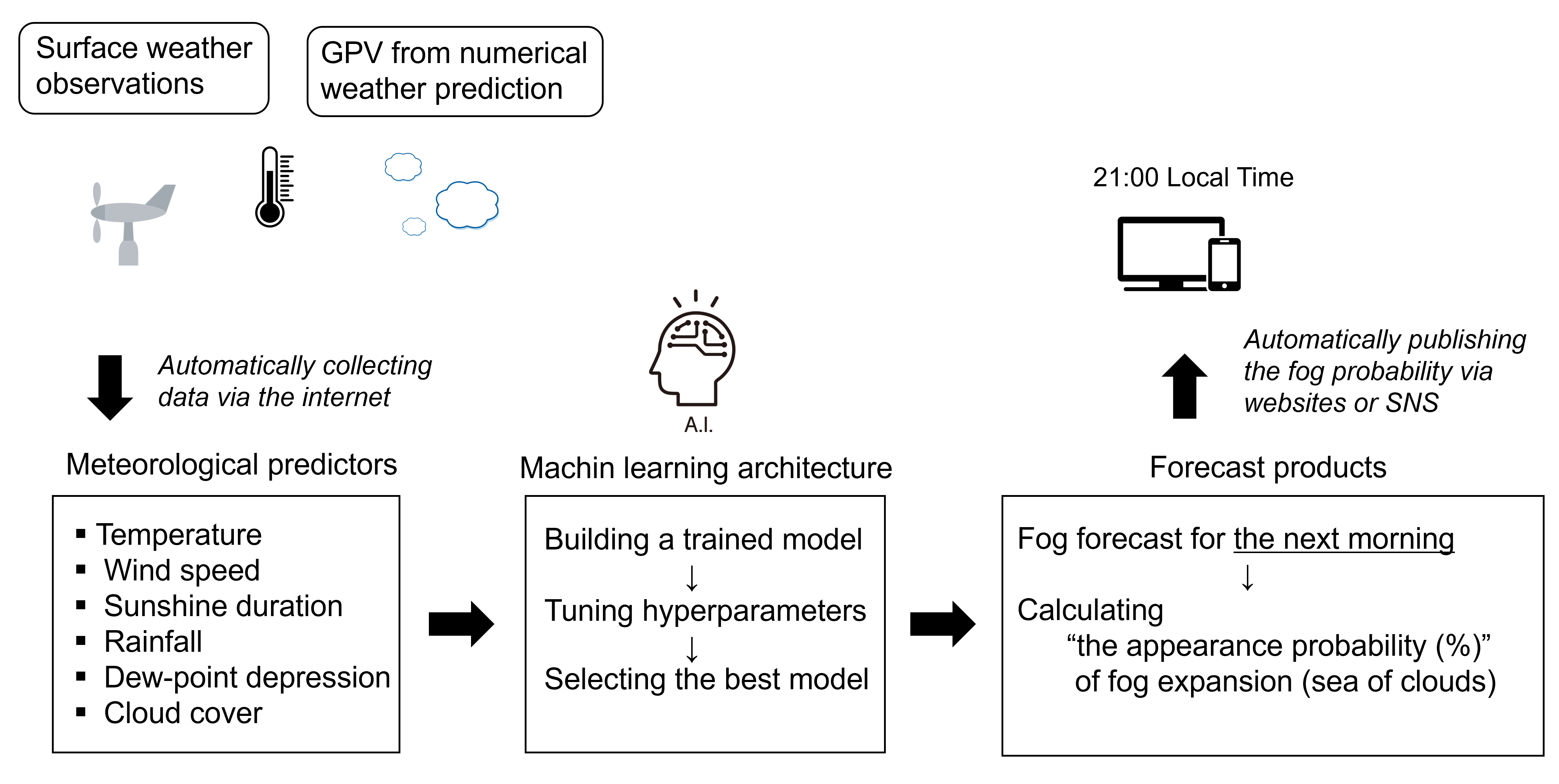 開発した雲海AI予報の流れをまとめた図。