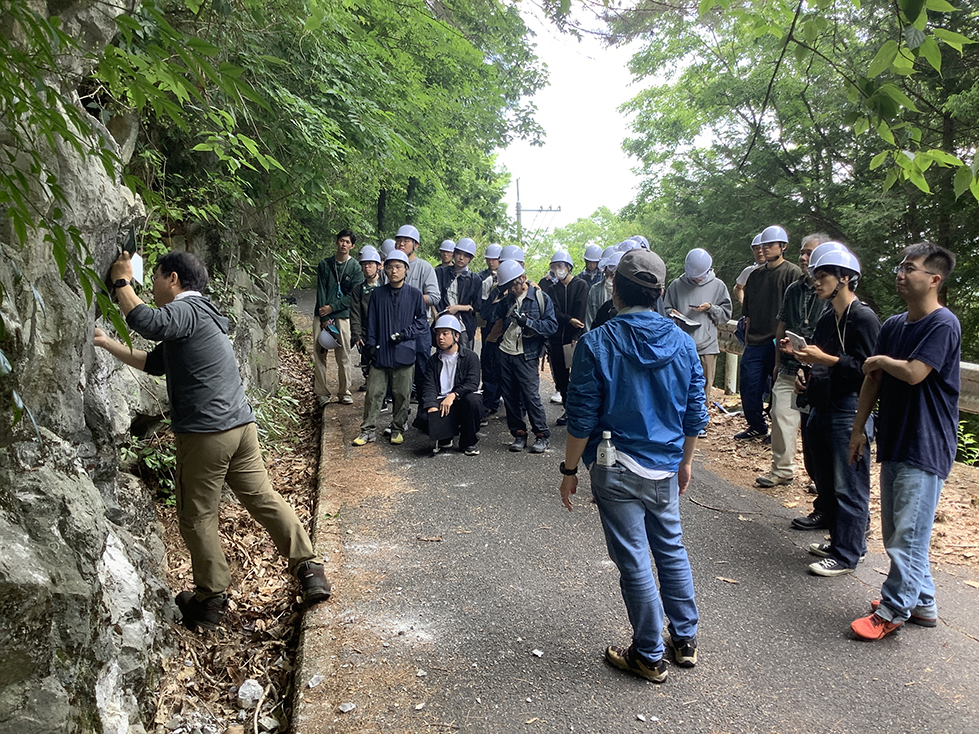 午前中は、阿哲石灰岩の露頭が見られる蟹川で、古生代のフズリナ(紡錘虫)などの化石採集を行いました。学生たちは地層の観察や採集作業を通して、フィールドでの地質調査と古生物の見つけ方を実践的に学びました。