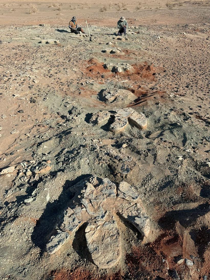 今回は理大の石垣忍・恐竜学博物館長らが、2018年の共同調査で発見したゴビ砂漠西部の大型ハドロサウルス類恐竜足跡化石産地について6月1~15日、継続調査を行いました。その結果、新たに世界最大級のハドロサウルス類足跡3個からなる歩いた跡(歩行跡)や、13個の足跡が24m連続した歩行跡などを発見しました。
