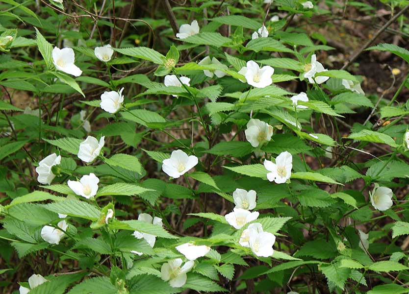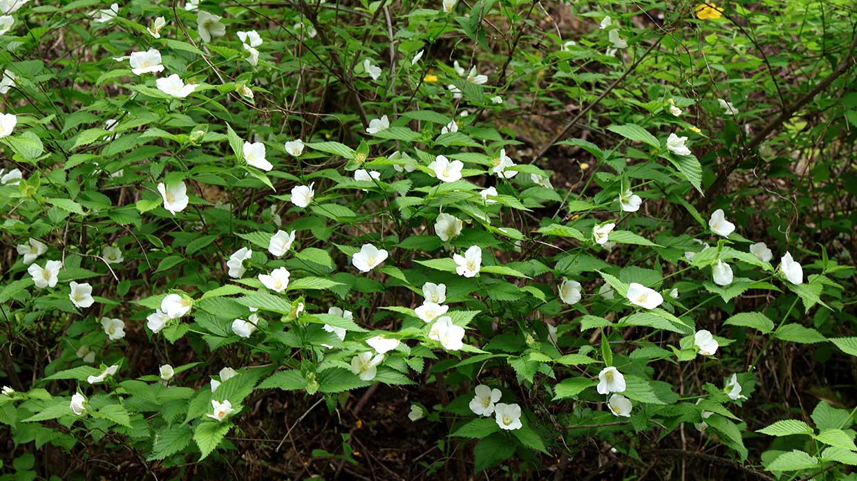 サクラやウメなどバラ科植物の殆どは花弁が5枚だが、シロヤマブキは4枚。
