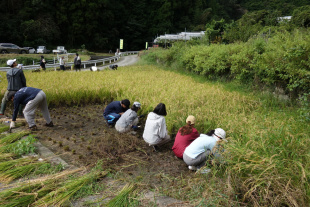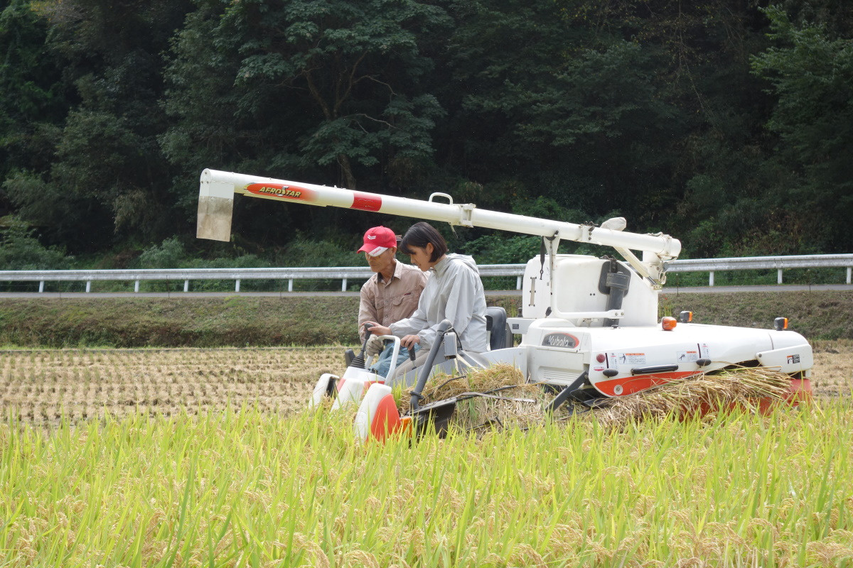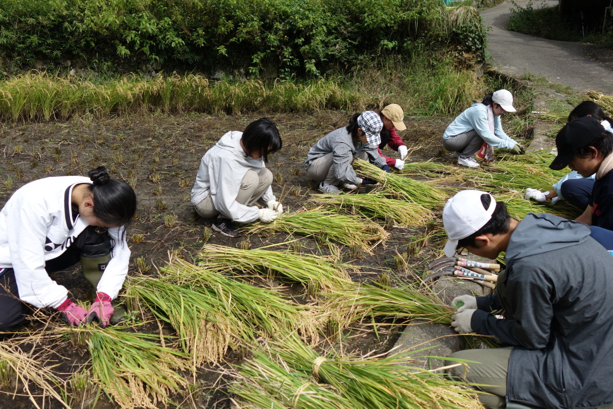 生物地球研究会の学生が、市内の田んぼで開催された稲刈りイベントに参加しました。地域の子供たちと一緒に稲を鎌を使った手刈りとコンバインを運転しての収穫の両方を体験しました。また、田んぼの中やその周辺の生物を採集し、それを参加者の人に向けて解説しました。 収穫した米は、乾燥と精米の後で11月に開かれる大学祭のときに販売されます。
