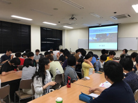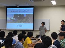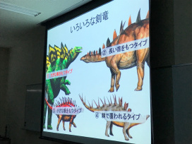 この春より岡山理科大学・生物地球学部・生物地球学科・恐竜・古生物学コースに着任されました林昭次先生が「剣竜類の板と棘の謎 」というタイトルで発表されました。 具体的には、ジュラ紀の植物食恐竜 剣竜類がもつ巨大な背の板や尾の棘の機能の 進化についての研究や研究の過程を紹介され、世界を股にかけたご研究の成果を披露されました. 来場者は、談話会史上最多の70名超!でした.by 宮本