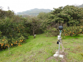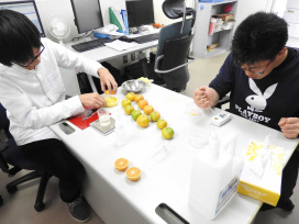 大橋研究室では昨年に引き続き、ミカンの成長と気象の関係を現地調査しています。5月の開花から始まり、果実の大きさと糖度などを定期的に測定しました。今年の夏は気温も高く降水の少ない時期があったり、逆に秋には例年よりも降水が多くなったりと、気候の変化が大きかったように思います。