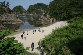 浦富海岸での巡検地の移動 石英砂の海岸を歩く