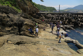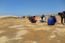 3年生対象地学実習では、5月20日~21日に山陰海岸ジオパークに指定されている鳥取砂丘・浦富海岸などで、地形地質調査法の野外実習を行ないました。炎天下の鳥取砂丘は大変な日差しでしたが、砂丘の大地形・微地形、古砂丘/新砂丘の層序を観察しました。浦富海岸では、花崗岩の波食地形や貫入岩類などを観察しました。