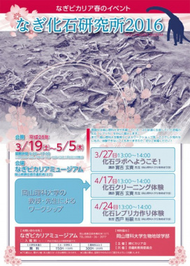 岡山県北部の奈義町にある奈義ビカリアミュージアムにおいて、3月19日(土)から5月5日(木)まで特別展『なぎビカリア春のイベント なぎ化石研究所2016』が開催されています。