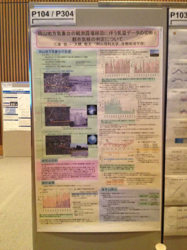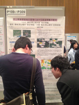 10月28-30日に京都で開催された日本気象学会秋季大会において、研究成果を発表してきました。今回は、岡山の気象データの長期解析と高梁盆地の高温現象に関する2テーマをゼミ生がポスター発表しました。全国大会ということもあり、たくさんの研究者や学生が集まるなか、ゼミ生は聴衆者に熱心に自分の研究を説明していました。いただいた意見やアドバイスを持ち帰り、これから研究を進めるうえで役立てていきたいです。