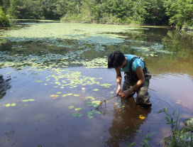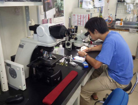 共同研究者の中国科学院西双版納熱帯植物園・伊藤博士とゼミ生とともに、岡山県内で水草の調査をおこないました。真夏の炎天下の中で水草を調査・採集し、実験室内で遺伝的変異の解析をおこないます。今後のデータ解析が楽しみです。