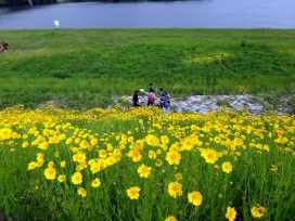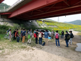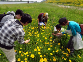 植物学実習 オオキンケイギクの生態と高水敷の植生 2015年05月15日 3年生対象の講義科目である植物学実習が行われました。今回は旭川の高水敷で植生調査の実習です。 実習では、特定外来生物であるオオキンケイギクと、その周囲に生育する植物を調べました。岡山県旭川ではオオキンケイギクが大繁茂して問題となっていますが、それはどのような要因によるのでしょうか? レポートではオオキンケイギクの生態と、河川の高水敷および堤防法面の環境に着目して繁茂の要因を考察してください。