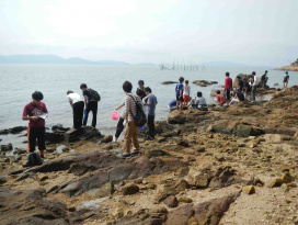 干潮時の磯に出て生物の採集と個体数の調査