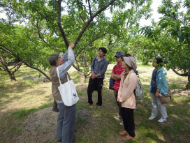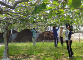 「農場実習」では, 5月9日に岡山大学農学部附属山陽圏フィールド科学センター・岡山農場を利用して,「キウイフルーツの摘蕾」を行いました. また, 農場内のモモやレモンなどの果樹についても学びました.(O.Y.)