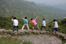 寒霞渓の地形を観察するため四方指の展望台に行き、あらゆる方向を指さす受講生たち