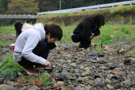 成羽町の福地川河原で礫観察と化石(三畳紀貝化石)採集