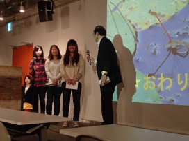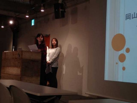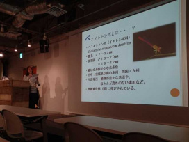 3月29日、東京のデジタルハリウッド大学、駿河台ホールにおいてNPO法人エコロジー・カフェ第9回シンポジウムが開催されました。そこで生地2年生の西俣さん、1年生の森さん、吉本さんの3人が、「岡山県下で初めて発見されたベニイトトンボ」と題した発表を行い、昨年夏に見つかったベニイトトンボについての報告や、そのきっかけとなった玉野市のおもちゃ王国での「昆虫調査隊」での取り組みなどについて紹介しました。前日の夜に岡山を出発して夜行バスでの東京行きでしたが、長旅の疲れも見せずに大勢の人たちの前で堂々と発表しました。