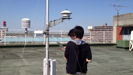 3月から続く大阪の気象観測のデータ回収作業に来ました。1か月半に1回、小学校等の施設屋上に設置させてもらっている気象測器(左写真)は、日射量計(中央写真の手前)、気温・湿度計(中央写真の奥側)です。この回収したデータは、卒業研究に使っていますが、長期の連続データからは色々と面白い結果が得られつつあります。来年4月まで、貴重な1年間のデータを少しずつ解析していきます。