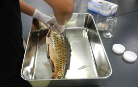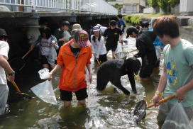 1年生対象の野外調査法実習Ⅰ「魚類」の実習を、5月17日に大学近くの水路で実施しました。各自がタモ網を持って魚を捕獲し、種の同定と体長の計測を行いました。大きなコイも捕れました。コイは中島ゼミの学生が研究に用います。