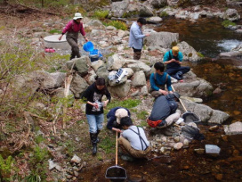 5月3~4日に鏡野町の白賀渓谷で、動物・昆虫学コースの中村ゼミ、武山ゼミが水生生物の調査を実施しました。今回の調査は夏に開かれる源流大学の下見も兼ねていましたので、現地で合流した岡山野生生物調査会のメンバーや関西高校、岡山理大附属高校の生徒とも交流を深めました。旭川の最源流域にあたる場所のため魚類は特産のヒラメ(アマゴ)以外はほとんど見かけませんでしたが、たくさんの水生昆虫を採集することができました。採集した昆虫はゼミ生が同定して夏以降の調査に生かす予定です。