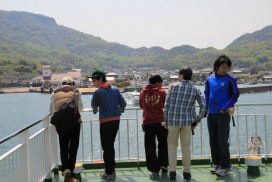 フェリー上で豊島の地形を見る実習生の皆さん