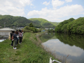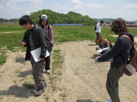 生物地球学科の講義「野外調査法実習Ⅰ(遺跡)」で、1・2年生の学生さんたちと岡山県赤磐市山陽地区の遺跡調査に行きました。 左の写真は8世紀中頃に創建された備前国分寺の跡で土器や瓦の調査をしているところです。初めは石と区別ができませんでしたが、次第にわかってきました。 右の写真は岡山県第3位の規模を持つ両宮山古墳の濠の横で古墳を見学しているところです。お天気がよく、とてもきれいでした。