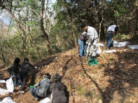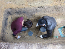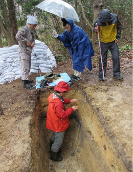 2013年3月22日~28日、岡山県備前市佐山というところで、備前焼のルーツとなる平安時代中頃と奈良時代終わり頃の須恵器というやきものの窯跡を発掘調査しました。3枚の写真は奈良時代の窯跡の調査風景です。 左:まず掘る場所を決めているところです。この下から8世紀後半頃の窯跡が出てきました。 中:狭い穴の中でほとんど壊れていない須恵器の蓋を掘っているところです。 右:宮本先生に花粉分析試料を取ってもらっているところです。