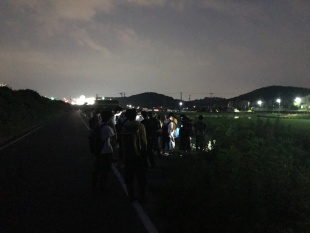 大学近くの水田で野外調査法実習Iを実施しました。担当は両生類がご専門で、今年4月に着任された木寺先生です。事前にカエルの種ごとの鳴き声の違いを学んだ学生達は、夜の水田をまわり、鳴き声を頼りに水田ごとの出現種を記録しました。