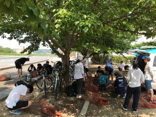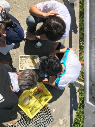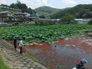 2年生対象の野外調査法実習II(脊椎動物)の野外実習は、ため池の魚類とカメ類を対象に実施されました。担当は、動物・昆虫学コースの亀崎先生(カメ)と武山先生(魚類)です。