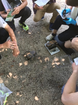 捕獲したカメは種同定の後、体重と体サイズを計測します。