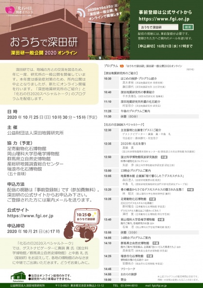 化石の日 関連イベントして、2020年10月25日(日)10時30分~15時に行われる「おうちで深田研」深田研一般公開2020オンラインイベントに本学、恐竜学博物館も参加します。このイベントでは、本学恐竜学博物館だけでなく、国立科学博物館、足寄動物化石博物館、群馬県立自然史博物館など全国様々な博物館とZoom中継を行い、貴重な研究者のお話しが聞けます。本学では石垣忍館長が本学の展示解説を行います。ぜひご覧ください。 *事前申し込みが必要です http://www.fgi.or.jp/
