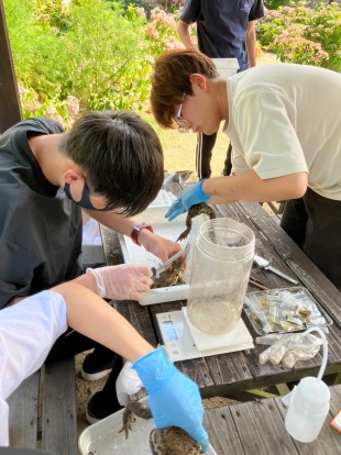 7/1から7/3にかけて,動物学実習(ヒキガエルの生態調査)を香川県丸亀市の本島で行いました.複数のグループが異なる環境下でルートセンサスを行い,島内におけるヒキガエルの生息分布について調査しました.翌日には持ち帰ったヒキガエルを計測,さらに胃内容物を採取し,本島におけるヒキガエル個体群の食性について調べました.とても暑い3日間でしたが,多数のヒキガエル(一晩で144個体!)を採集でき,さまざまな新しい発見がありました.