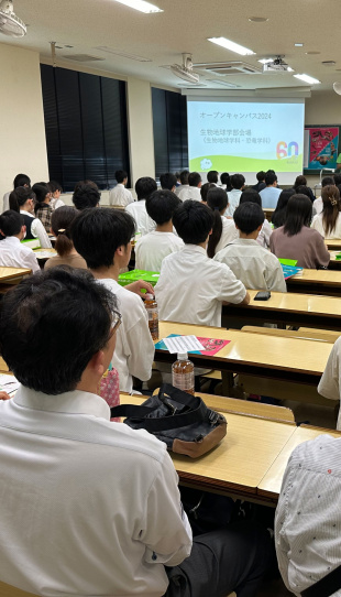 昨日オープンキャンパスを開催しました。今回は生物地球学部の説明会開始前の状況ですが、大講義室が満員の盛況。数名にお話を伺うことができました。地震を学びたい、土砂災害を学びたいと大学を探して、来学されたとのこと。遠方からお越し頂き感謝いたします。次回は、7月27日(土)、28日(日)に開催予定です。今回から総合型選抜に関する情報提供がなされますので、ぜひご来場ください。
