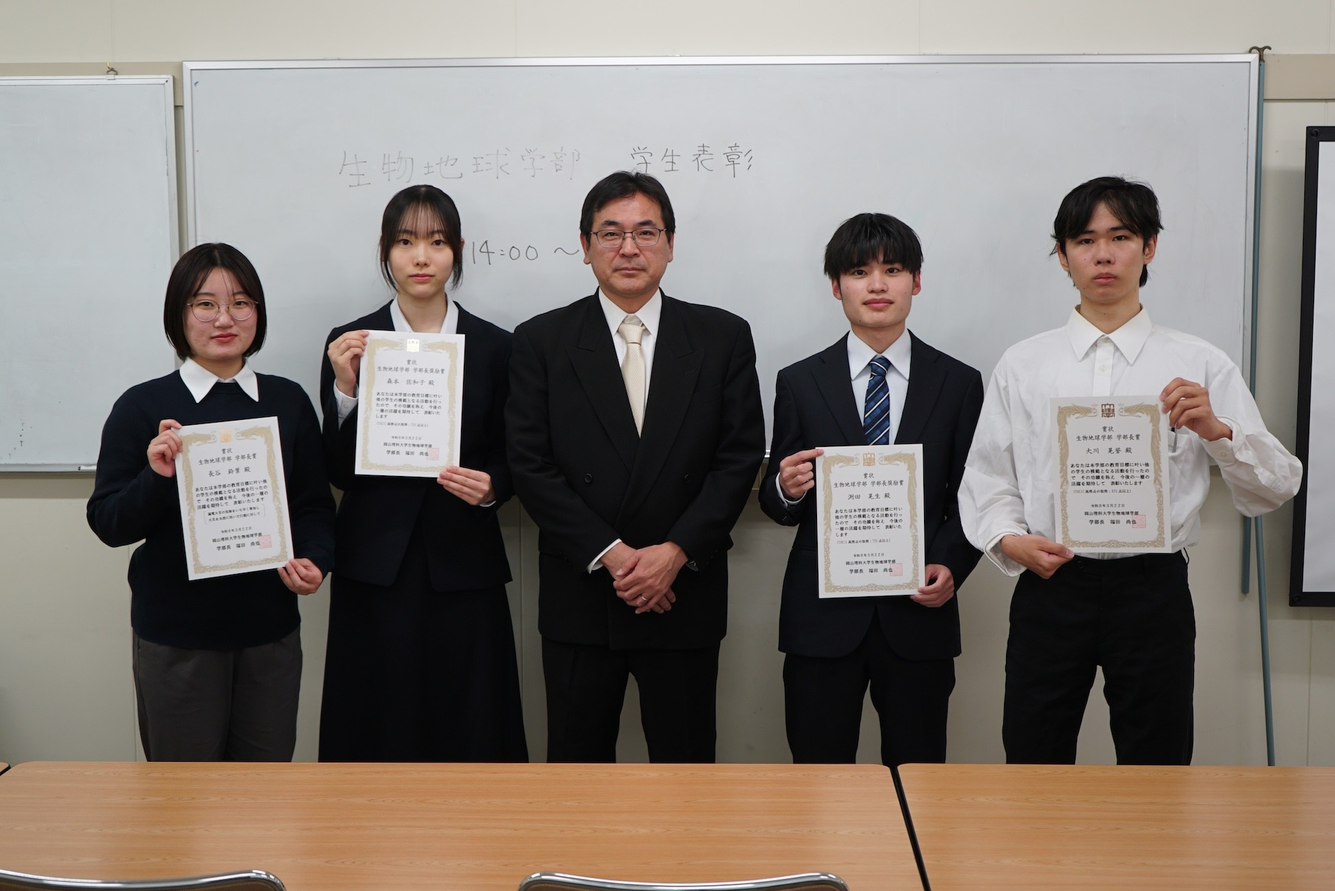 2025年度から生物地球学部にて学生表彰を行うことになりました。生物地球学部の教育目標に叶い、他の学生の模範となる活動を行なった学生を表彰します。賞には、学部長賞と学部長奨励賞の2種類があり、学部長賞が上位の賞となります。2025年度は5名の学生を表彰しました(学部長賞2名、学部長奨励賞3名)。火災を事前に防いだ行動をおこなった学生とTOEICの高得点者を表彰しました。
