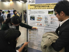 大学院生の三浦さんは、局地風の肱川あらしの発生予測と、岡山アメダスの移転による観測データへの影響、の2件を口頭発表しました。4年生の安保さんと藤井さんは、ウンシュウミカンと気象条件の関係をポスター発表しました。そして教員の大橋は、柑橘の寒害ダメージの数値シミュレーションと、専門分科会のオーガナイザーを務めました。それぞれ、集まった多くの研究者から意見を伺うことができ、とても盛況でした。今後、学生たちは学内の中間発表会に向けて、今回得られた改善点を反映していく予定です。