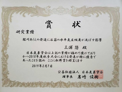 昨年おこなわれた日本気象学会の全国大会(2018年度秋季大会)で、大学院生の三浦悠さんが日本気象学会松野賞を受賞しました。 口頭発表の審査によって特に優秀な大学院生への賞で、エントリー13名のなかから三浦さん1名が選ばれました(2019年2月7日決定)。 発表題目は「肱川あらしの発達に谷筋の水平気圧傾度が及ぼす影響 」で、現地での長期観測から肱川あらしの発達と気圧場の関係を明らかにした、岩手大学グループとの共同研究での成果でした。 参考URL(日本気象学会)