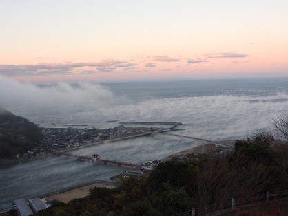 「肱川あらし」は、霧を伴った強風が大洲盆地から肱川沿いに河口へ向けて吹き下ろす現象です。