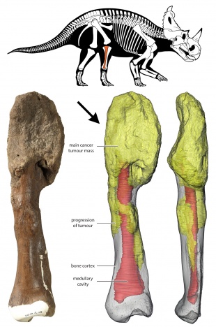 骨肉腫は、骨が過剰に造られ、発生源である骨から他の臓器に転移することも多い骨のがん。今回の研究で骨肉腫が見出されたのは、約7700〜7550万年前に生息していた角竜類恐竜「セントロサウルス・アペルタス」(Centrosaurus apertus)の腓骨(すねの骨)です。もともと、1989年にカナダ・アルバータ州の恐竜州立公園で発見されたもので、骨の端が大きく変形していたため、骨折が治癒したものだと考えられていました。