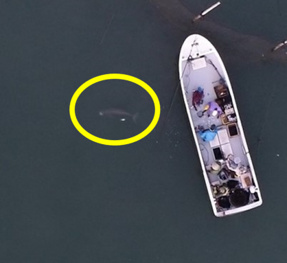 漁船に近づいて餌をたべるスナメリ(黄色の枠内)