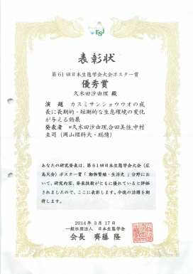 2014年3月14~18日にかけて広島国際会議場で開催された第61回日本生態学会大会で、生物地球学科3年生(現4年生)の久木田沙由理らの発表が「動物繁殖・生活史」分野におけるポスター賞(優秀賞)を受賞しました。
