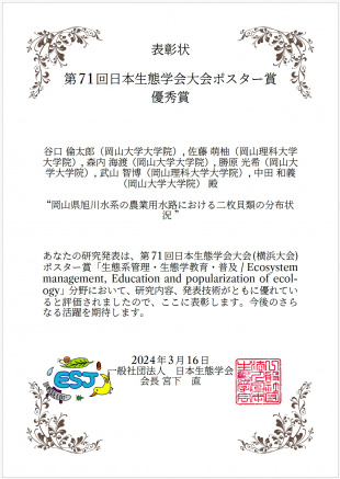 日本生態学会71回大会(ESJ71 横浜大会)のポスター発表において,岡山大学と武山研究室の共同研究が優秀賞を受賞しました。 第71回日本生態学会ポスター賞・優秀賞 分野:生態系管理・生態学教育・普及 発表演題「岡山県旭川水系の農業用水路における二枚貝類の分布状況」 発表者:谷口倫太郎(岡山大学大学院), 佐藤萌柚(岡山理科大学大学院), 森内海渡(岡山大学大学院), 勝原光希(岡山大学大学院), 武山智博(岡山理科大学大学院), 中田和義(岡山大学大学院)