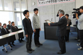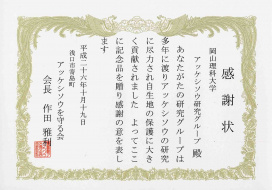 アッケシソウ発見10周年記念式典が10月19日(日)浅口市寄島町サンパレアで開催されました。 岡山理科大学アッケシソウ研究グループに対して感謝状が授与されました。 岡山県寄島干拓地で初めてアッケシソウが発見されてから、生物地球学科と基礎理学科の教員と学生で構成する研究グループにより、生活史や生育環境の研究および現地での保護活動に協力してきました。 授賞式では生物地球システム学科・星野研究室の山本祐輔君と真鍋智弘君が代表して賞状と副賞を 受け取りました。