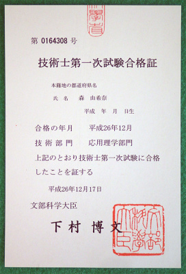 先日、国家資格の一つである技術士補の合格発表があり、森由希奈さん(佐藤研究室)が合格しました。 『技術士』は、医学における『医師』、法学における『弁護士』と同じく、技術者における『士』資格です。 『技術士補』は『技術士』になるために必要で建設コンサルタント業界必須の資格です。入社後すぐに取得するよう薦められます。 森さんは、就職活動前から将来を見据えて希望する職種(建設コンサルタント企業志望⇒内定)における必要な資格取得に取り組み、見事合格できました。