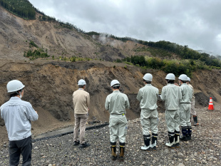 国土交通省のお計らいで、大規模崩壊現場に立ち入らせていただき調査を行うことができました。 崩壊原因とその対策状況について監督官の説明を伺うことができ、良い経験ができました。 中国地方では見ることのできない巨大な深層崩壊と重機を目の当たりにしてとても驚きました。 出来たての砂防堰堤も見事でした。